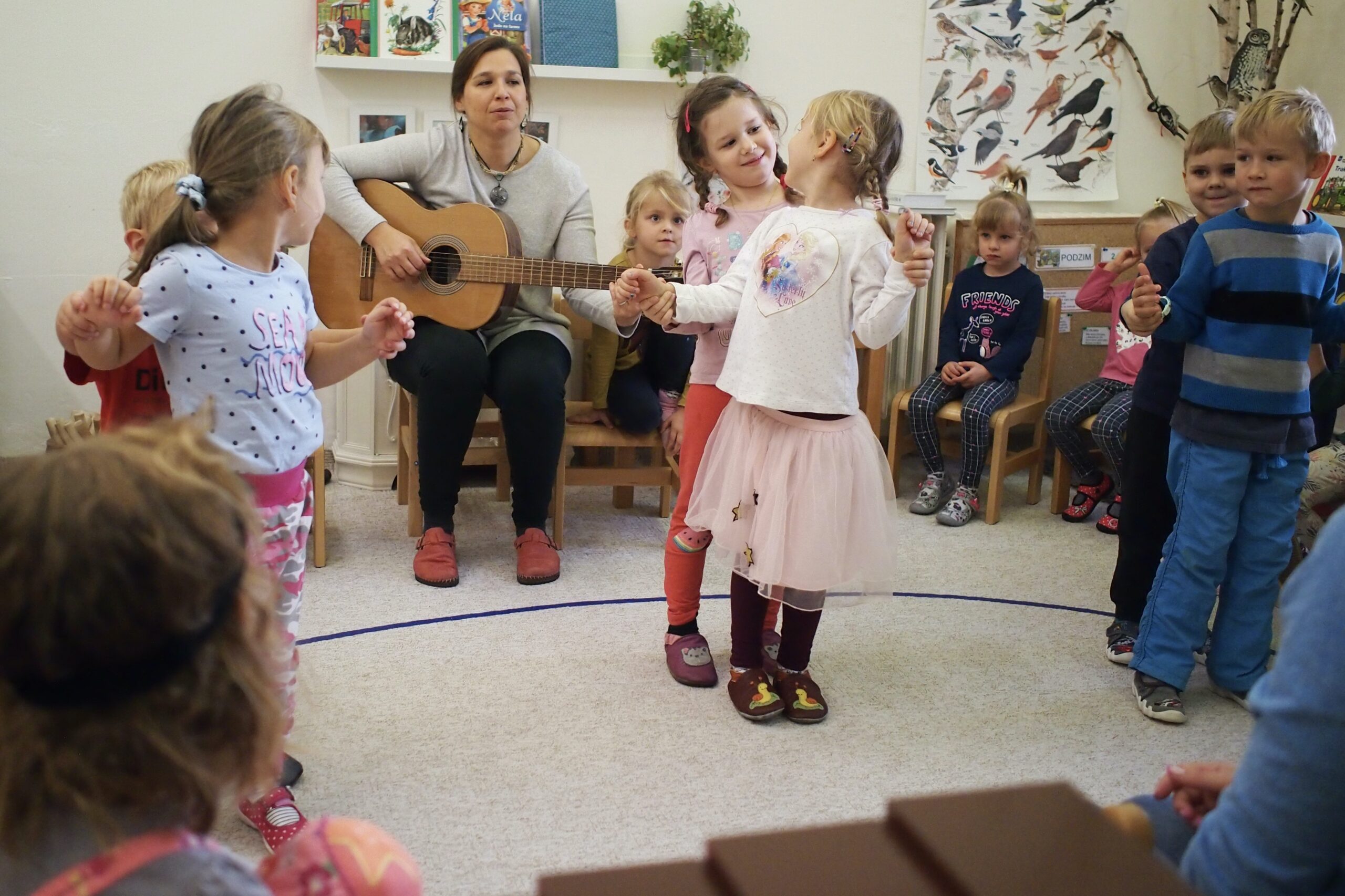 Materiály a pomůcky jsou v nízkých otevřených policích, aby si děti na vše dosáhly samy. Každý den se společně sejdeme v komunitním kruhu – povídáme si, zpíváme, máme pohybová cvičení.