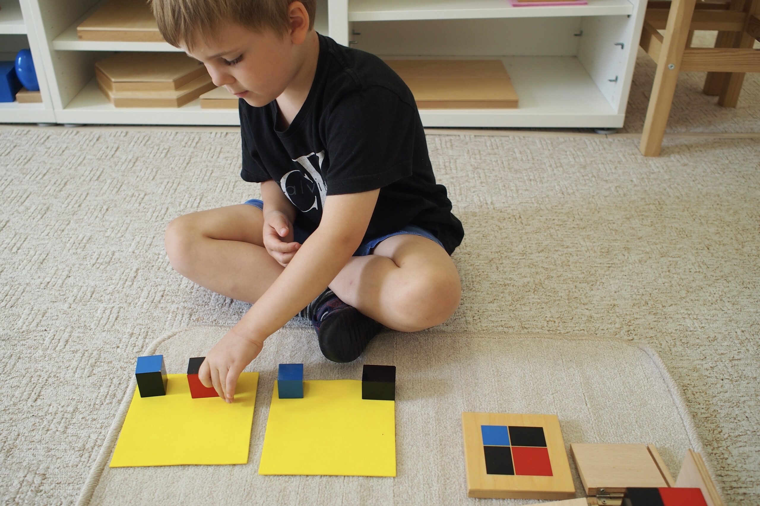 Děti pracují s Montessori materiály, které podporují objevování, třídění a uspořádání informací, myšlení a celkově přípravu na školu a na život.